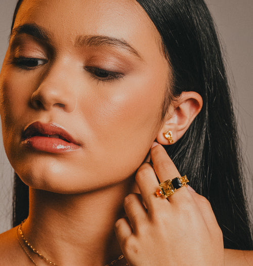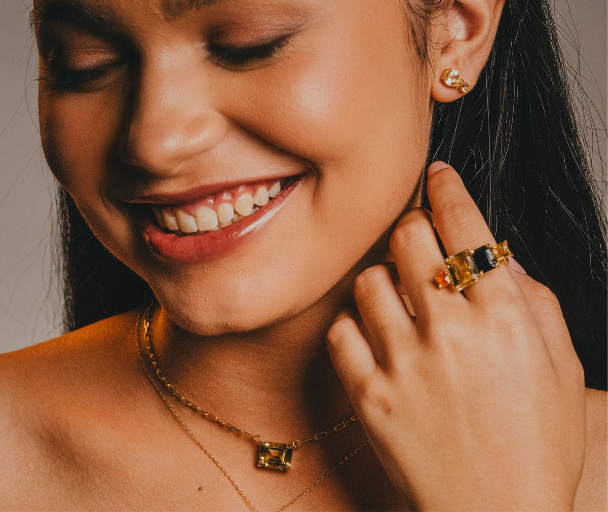 Assim como os primeiros raios do amanhecer, sua pedra central capta e devolve a luz com intensidade única. O design valoriza as mãos com leveza, criando um brilho que se destaca de forma natural e elegante.