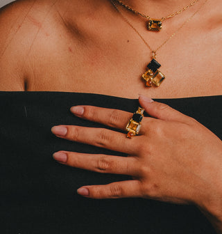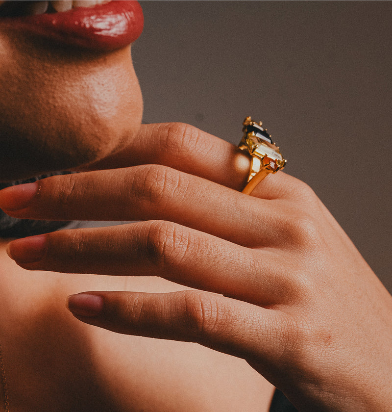 Assim como os primeiros raios do amanhecer, sua pedra central capta e devolve a luz com intensidade única. O design valoriza as mãos com leveza, criando um brilho que se destaca de forma natural e elegante.
